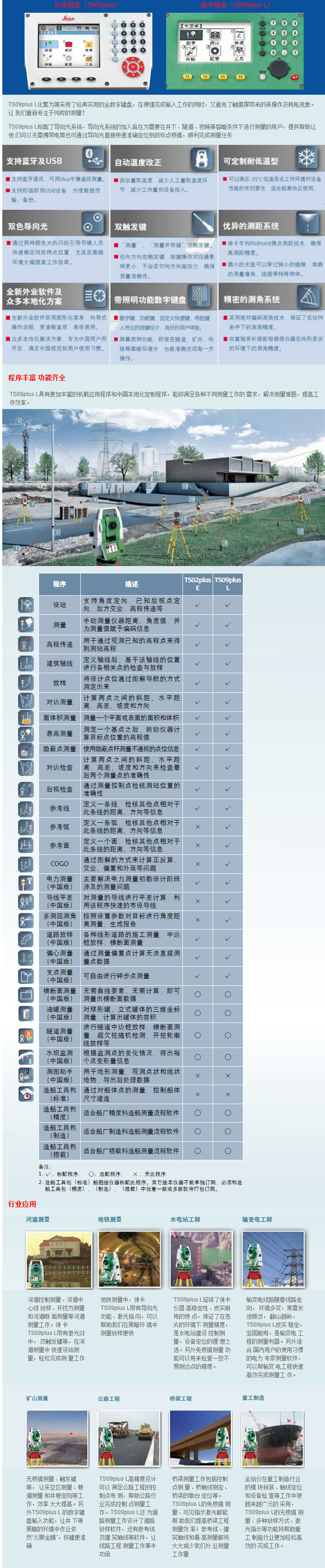徕卡亚新(中国)系统TS09plus L是一款集瑞士光学与机械制造极致技术工艺和中国测绘工作需求的一款全新产品。TS09plus L采用了更加简约实用的数字键盘并标配导向光功能它将会是中国亚新(中国)工程师们最得心应手的一款仪器