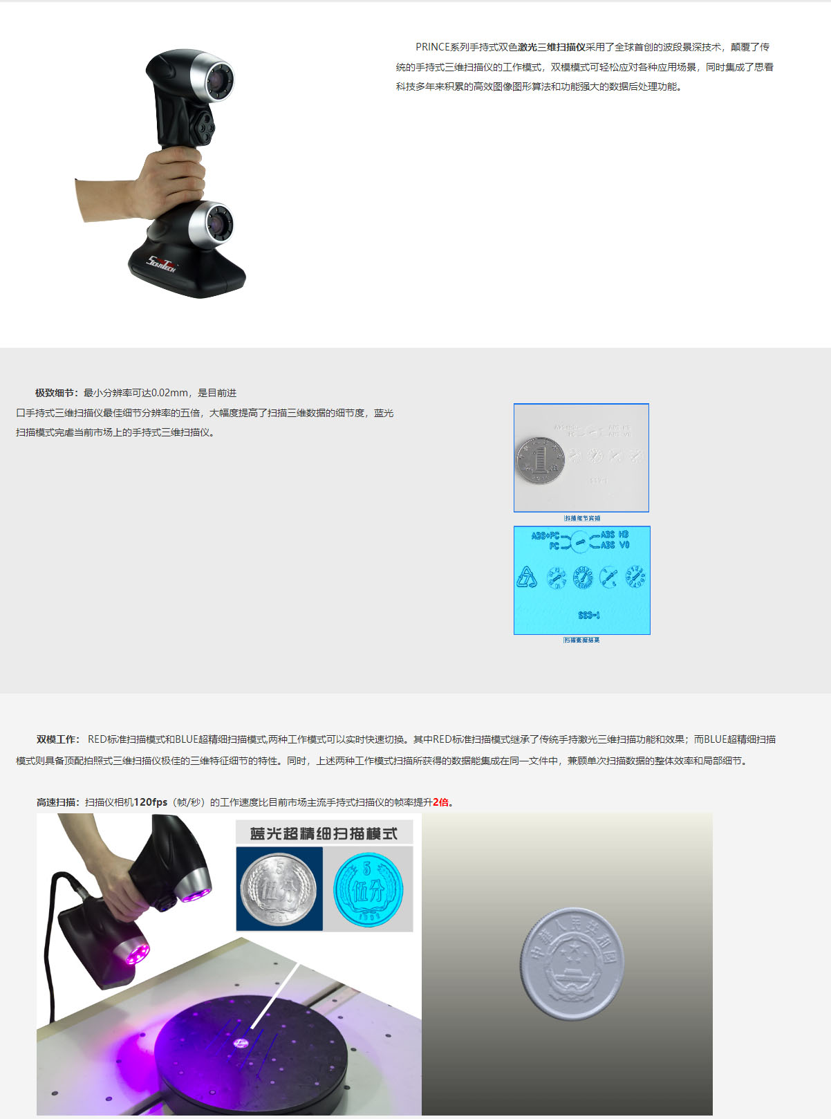 PRINCE系列手持式三维扫描仪完美解决了目前行业内的各大痛点,其全球首创的红蓝激光双模工作模式兼顾了手持式三维扫描仪的便携灵活高效以及拍照式三维扫描仪的高分辨率高细节度,扫描对象大到一架飞机,小到一枚硬币,都可以轻松应对,是当前三维检测行业的不二选择。