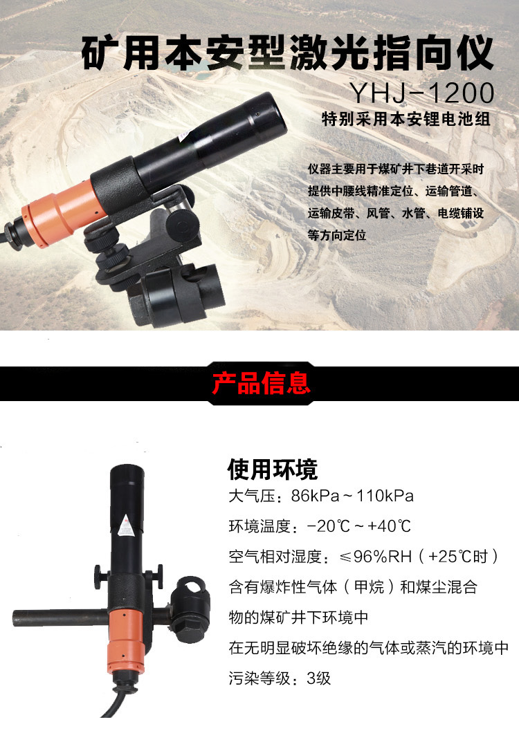 YHJ矿用本安型激光指向仪是集电子、光学、精密机械等技术为一体的仪器。具有外形美观、体积小、重量轻、防爆等特点。仪器通过悬挂组可快速固定在锚杆上,可在360°范围任意粗调,微调准确;调节方便,制动可靠。产品采用自主研发的光学系统,可采用红、绿两种光源,光斑大小、射程满足矿下施工需求。产品配用DC3.6V LH400-D61HC3BRL电源组,不需要在现场接入其他电源,可使仪器广泛用于无交流电源厂